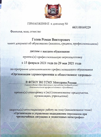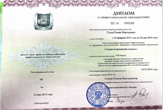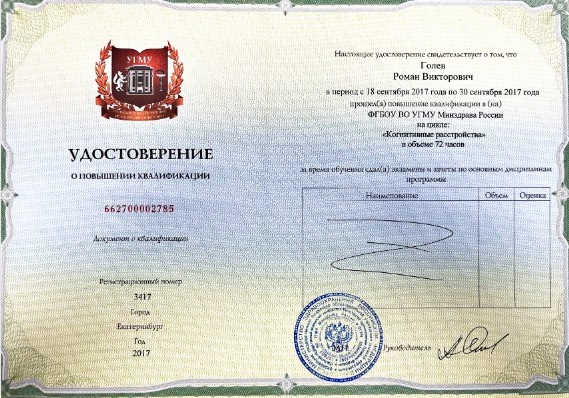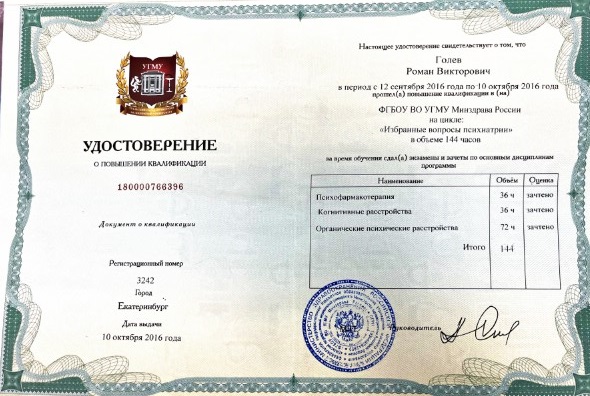- Ординатура по специальности "Психиатрия" в Уральском государственном медицинском университете.